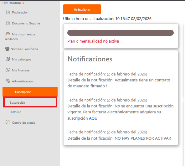 En la página de inicio de la plataforma (Dashboard) encontrará el cuadro de Notificaciones, donde se le informará que no tiene una suscripción vigente mediante el siguiente mensaje: “No se encuentra una suscripción vigente”. Para continuar, diríjase al menú lateral izquierdo y haga clic en el módulo Suscripción.
