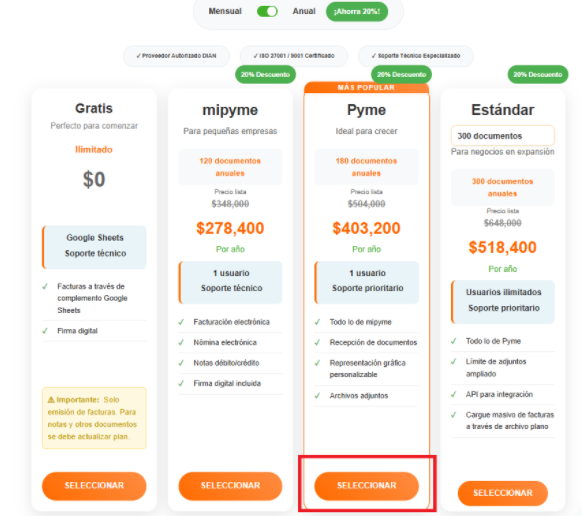 IMPORTANTE: Para planes anuales, se habilita la opción de pago por transferencia o ventanilla, para realizar dicho pago debe solicitar la factura al correo facturacion@misfacturas.com.co adjuntando el RUT actualizado de la empresa.