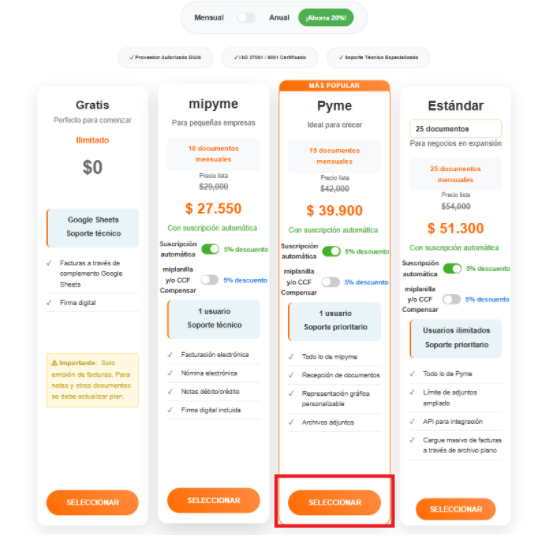 2. Una vez ingrese a renovar la suscripción, encontrará un resumen de su plan actual. Posteriormente, diríjase a la parte inferior de la pantalla, en la sección “Comprar planes”, donde podrá visualizar las opciones disponibles. Allí tendrá la posibilidad de elegir entre renovación mensual o anual, de acuerdo con el volumen de emisión de documentos durante cada período.