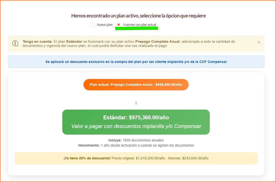 Si realiza la compra del nuevo plan antes de que finalice la vigencia del plan actual, podrá fusionar los documentos pendientes por usar con los del nuevo plan.