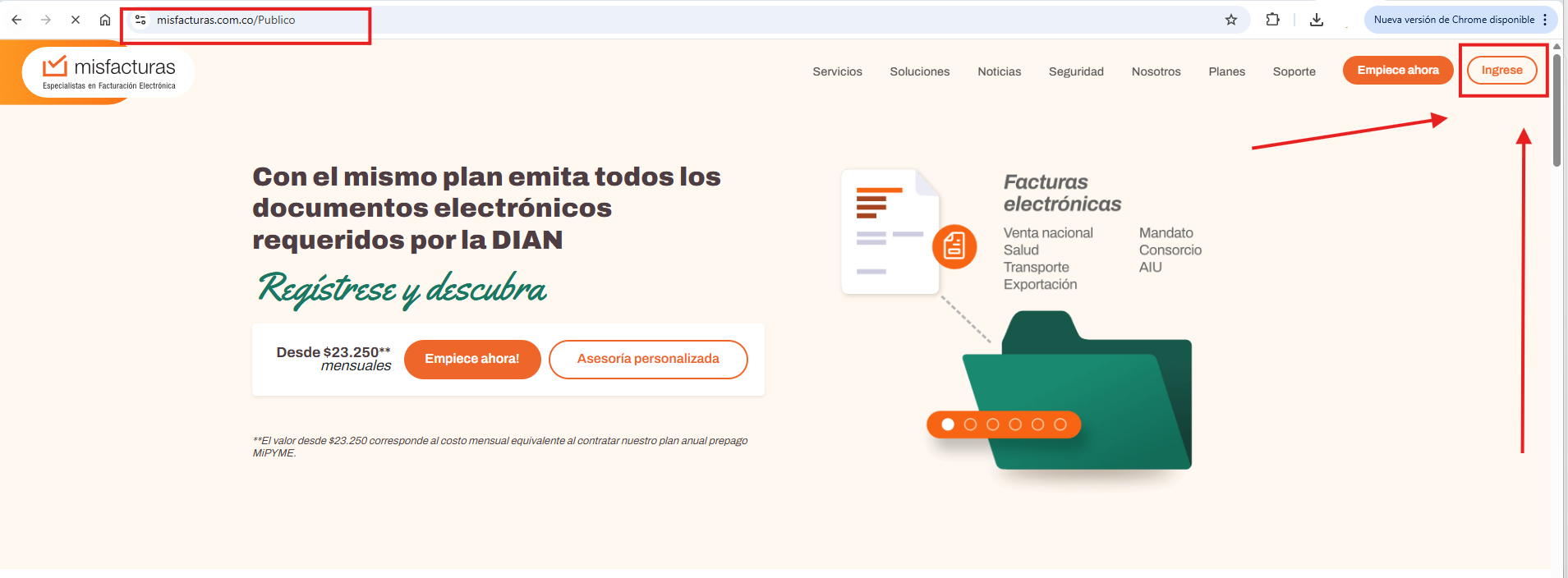 1. Ingresar a la página de mis facturas https://www.misfacturas.com.co y dar click en la opción INGRESE