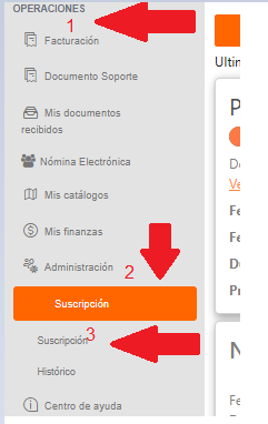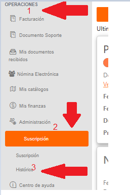 Otra forma de validar el estado del plan de Mis Facturas es ingresando al módulo de Suscripción, ubicado en el menú lateral izquierdo dentro de la sección de operaciones. Allí, en la parte inicial de la página, podrá visualizar el estado del plan que tiene activo actualmente.