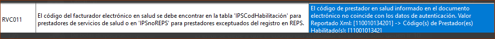El código del facturador electrónico en salud se debe encontrar en la tabla ´IPSCodHabilitacion´ para prestadores de servicios de salud o en ´IPSnoREPS´ para prestadores exceptuados del registro en REPS.