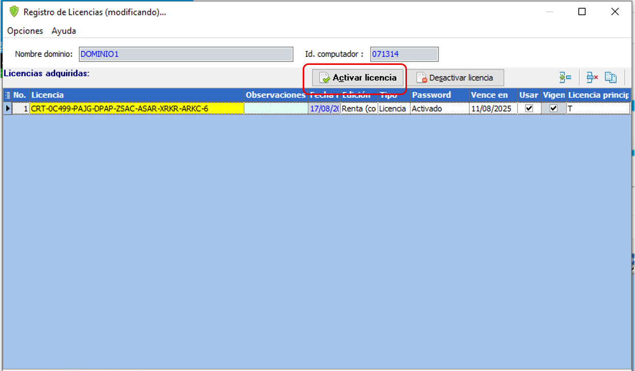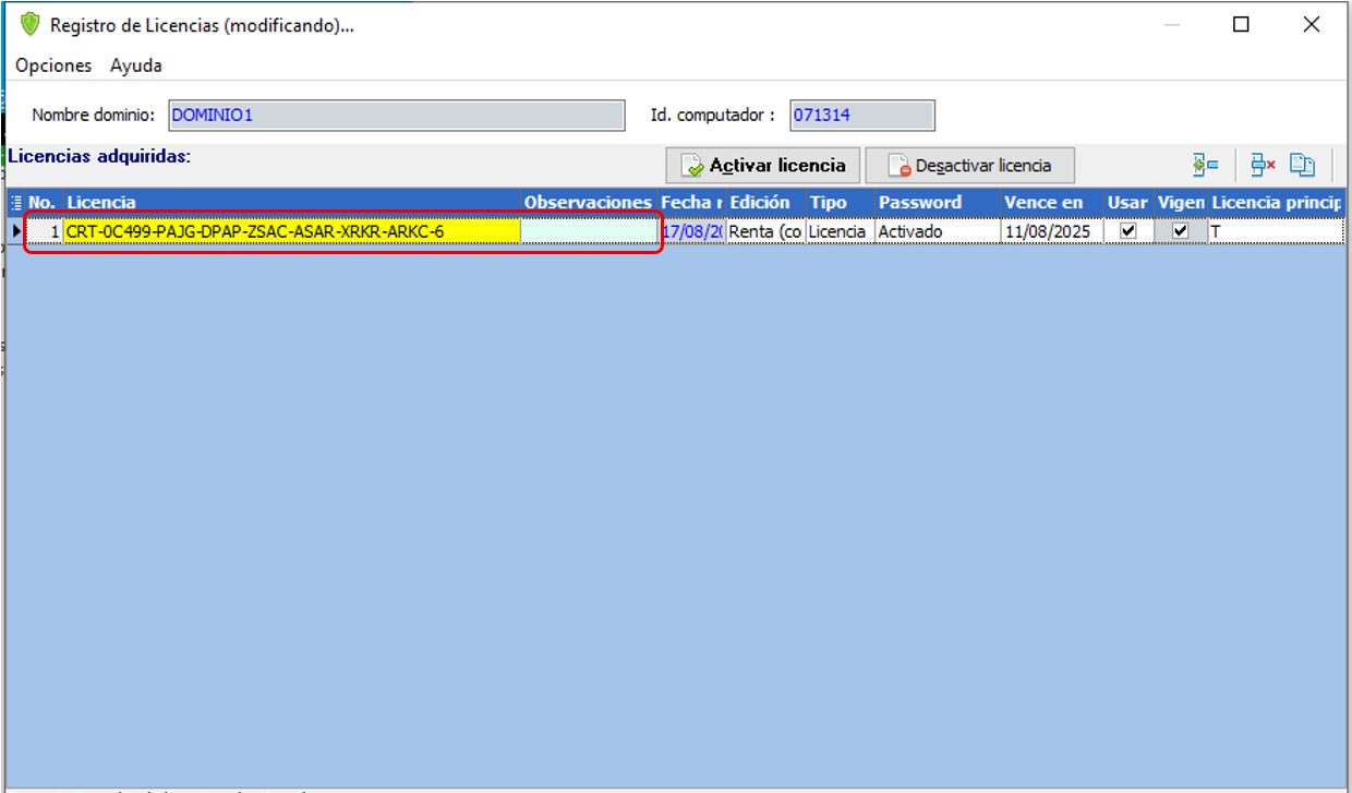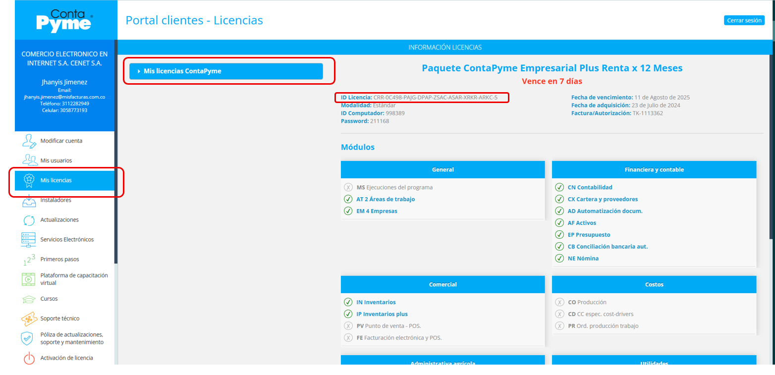 Ingrese a la opción “Mis licencias” y verifique la nueva licencia adquirida.Copie el ID de la nueva licencia y péguelo en el catálogo de licencias dentro del sistema.
