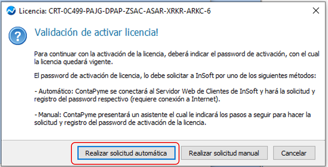 Seleccione la opción “Realizar solicitud automática”. Esto actualizará la fecha de vencimiento de su licencia.