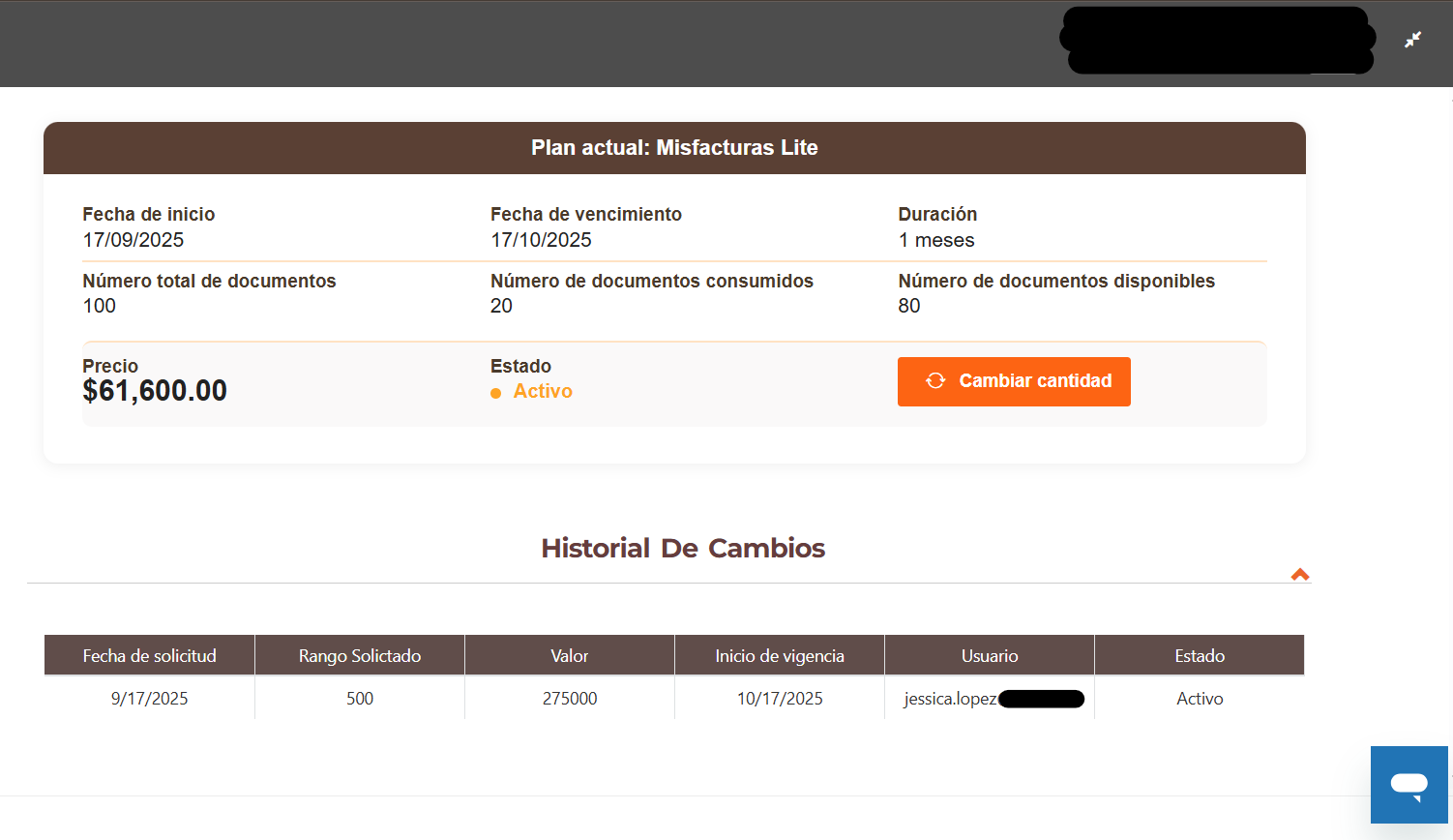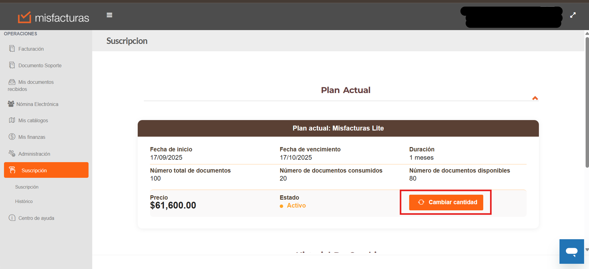- Le abre la ventana de suscripción y en la sección de Plan actual se encuentra un botón en naranja que indica CAMBIAR CANTIDAD