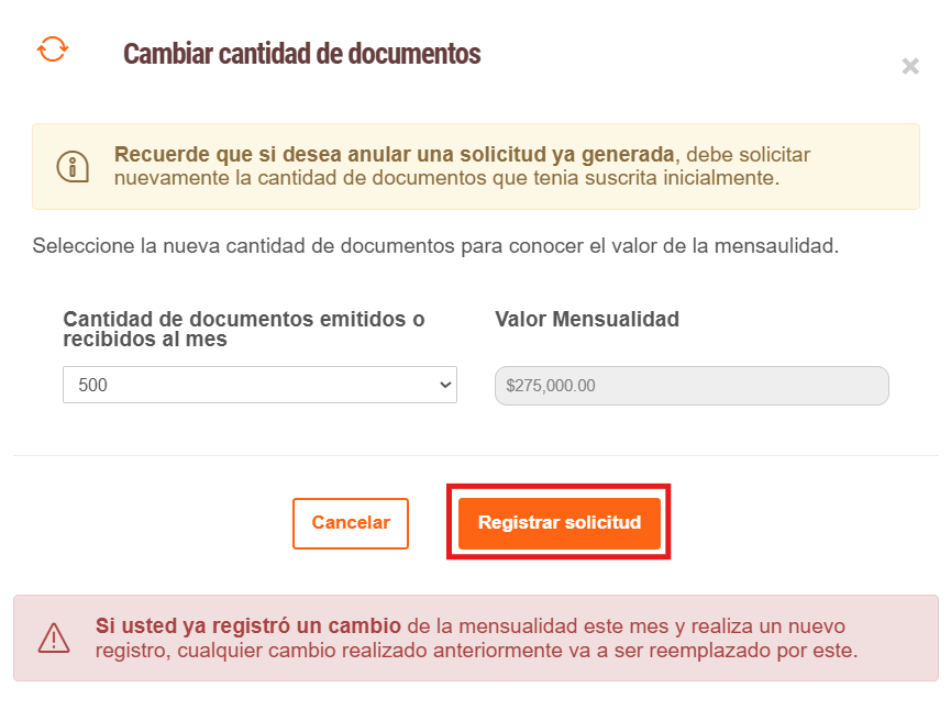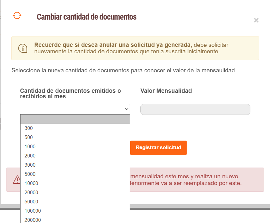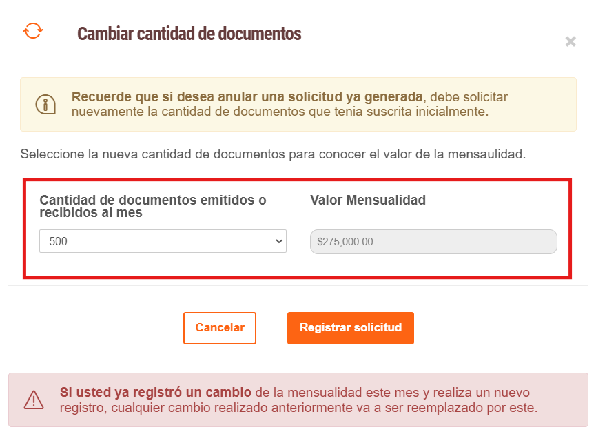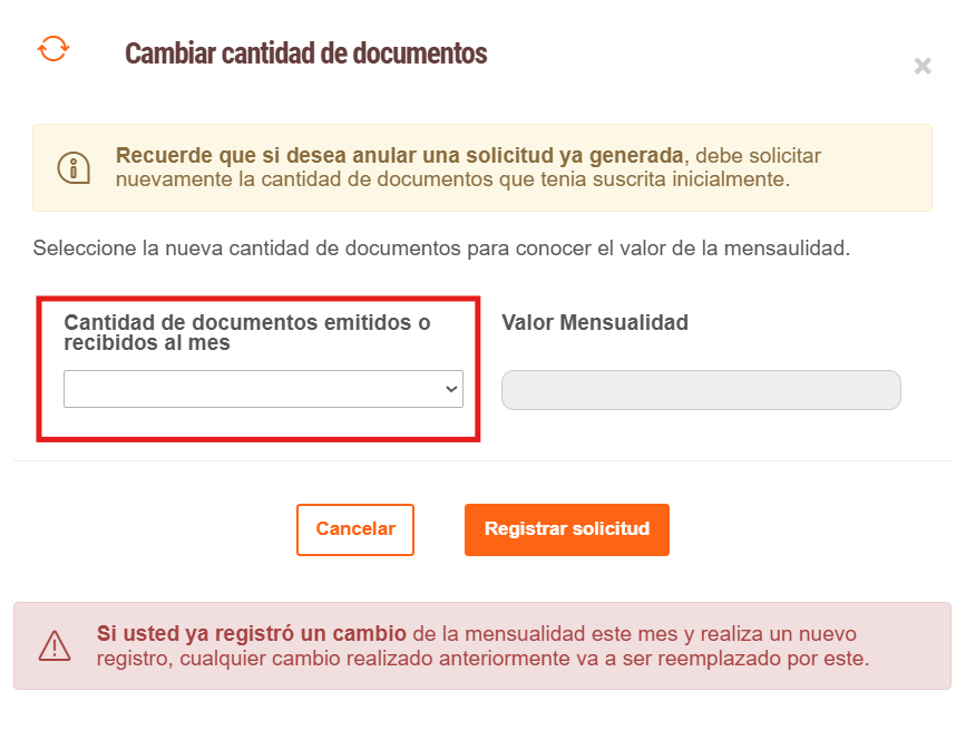 - En la sección de Cantidad de documentos emitidos o recibidos al mes le aparecerá las opciones para el cambio de documentos y a su derecha el valor a cancelar en el mes.