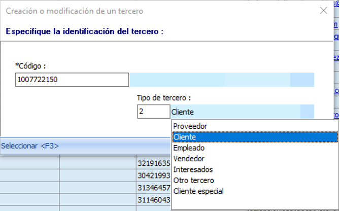 Una vez haga clic en “Crear”, el sistema le solicitará ingresar el código, que corresponde al número de identificación del tercero. Luego, deberá seleccionar el tipo de tercero según corresponda.
