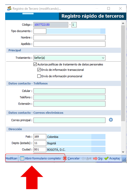 Se abrirá un formulario de creación rápida, donde deberás ingresar la información básica del tercero: