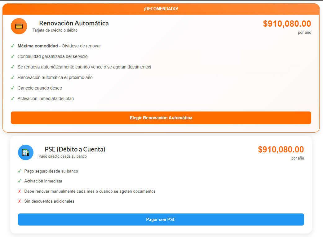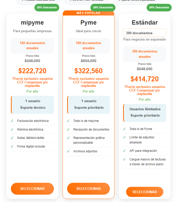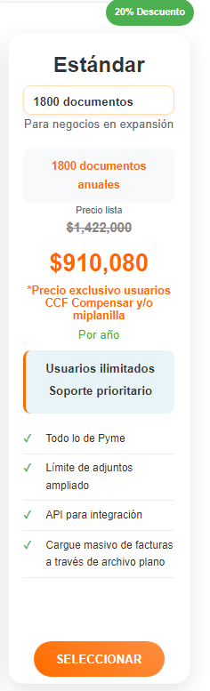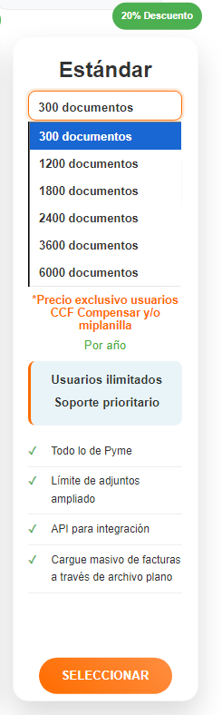 y si es cliente de Mi Planilla o de la caja de compensación de Compensar tendrá otro descuento adicional del 20% - Para visualizar los planes anuales de 1200 en adelante se ubica en el plan estándar selecciona en la cantidad de documentos para que se despliegue el listado de los demás planes.