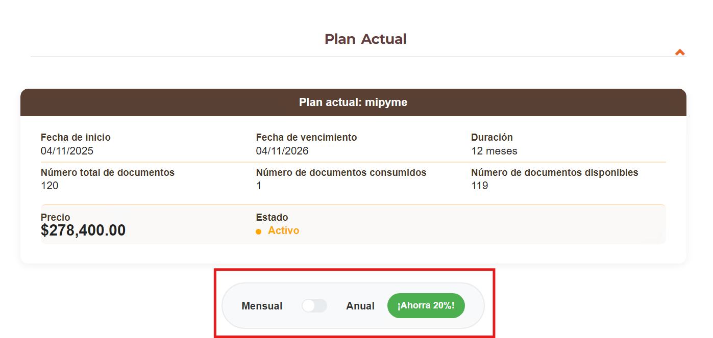 - puede visualizar la informacion del plan actual, el cual debajo del cuadro esta la opción de planes mensuales y anuales