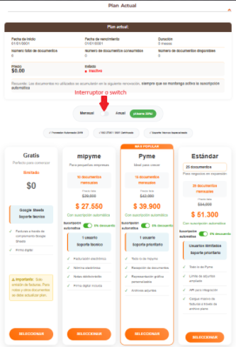 Luego, seleccione la opción “Suscripción” y, nuevamente, haga clic en “Suscripción” para continuar con el proceso.Para activar la visualización de los planes anuales, haga clic en el interruptor o “switch” correspondiente. De esta forma, se mostrarán las opciones de planes anuales disponible