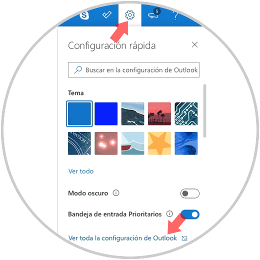 1. Lo primero que tenemos que hacer es desplegar el menú situado en el lateral derecho representado por una tuerca y hacer clic en el apartado que pone “Ver toda la configuración de Outlook ”.