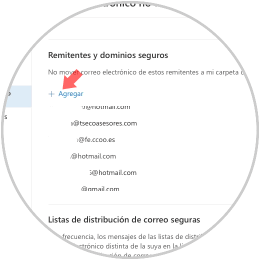 3. Se debe desplazar hacia abajo hasta llegar a la sección Remitentes y dominios seguros. Dentro de esta sección hacer clic en la opción +Agregar