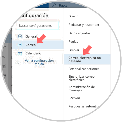 2. Lo siguiente que debemos hacer es seleccionar en el lateral izquierdo "Correo" - “Correo electrónico no deseado”