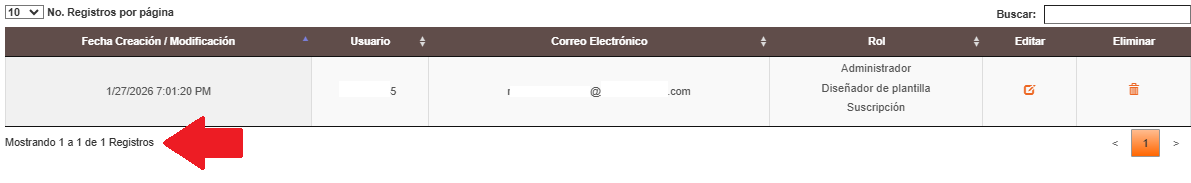 3. Para eliminar usuarios creados, sobre el registro del mismo debe dar clic en la opción eliminar