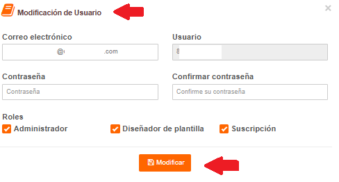 Allí se abrirá la ventana emergente de modificación de usuario para generar el cambio correspondiente y luego debe dar clic en el botón de modificar