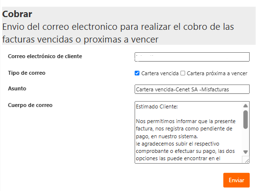 Recuerde que la opción de "Cobrar" se utiliza cuando la factura aún no se encuentra en mora, para enviar un correo recordatorio al usuario para que realice el pago de la factura: