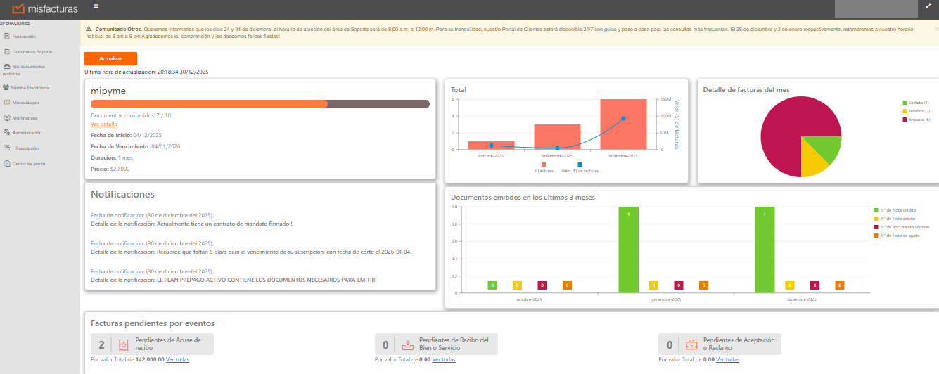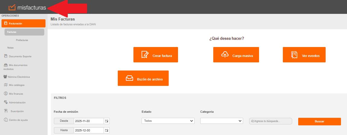 Nota: En caso de que se encuentre en otro modulo de la plataforma, para poder visualizar la pagina de inicio y notificaciones debe dar clic sobre el logo de misfacturas que se encuentra en la parte superior izquierda de la pantalla