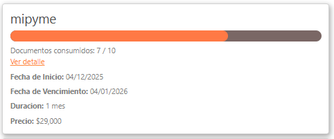 - Resumen del consumo del plan de los documentos permitidos en el plan adquirido, fecha de inicio, fecha de vencimiento y el valor del plan. En caso de que el plan se encuentre vencido se mostrará la invactivación del mismo