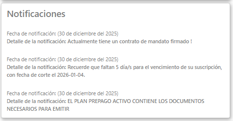 Notificaciones donde se indica el estado general del plan, si esta próxima a vencerse alguna de las resoluciones asociadas en el sistema y datos requeridos por mis facturas como el estado del contrato, cada notificación cuenta con su respectiva fecha de actualización