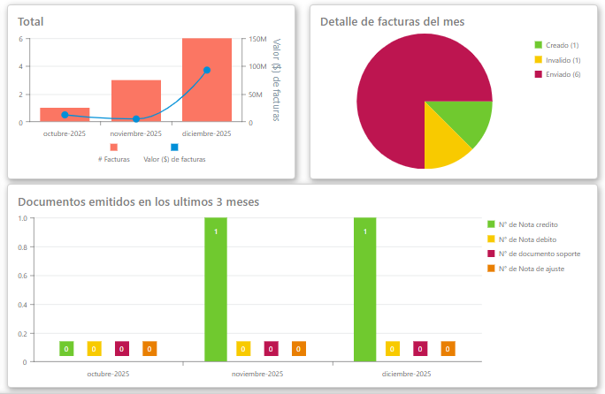 La visualización de 3 gráficos con el resumen trimestral de los documentos emitidos a la DIAN para identificar el comportamiento de la facturación de la empresa, se muestran 3 tipos de gráficos diferentes con la especificación de cada mes del trimestre