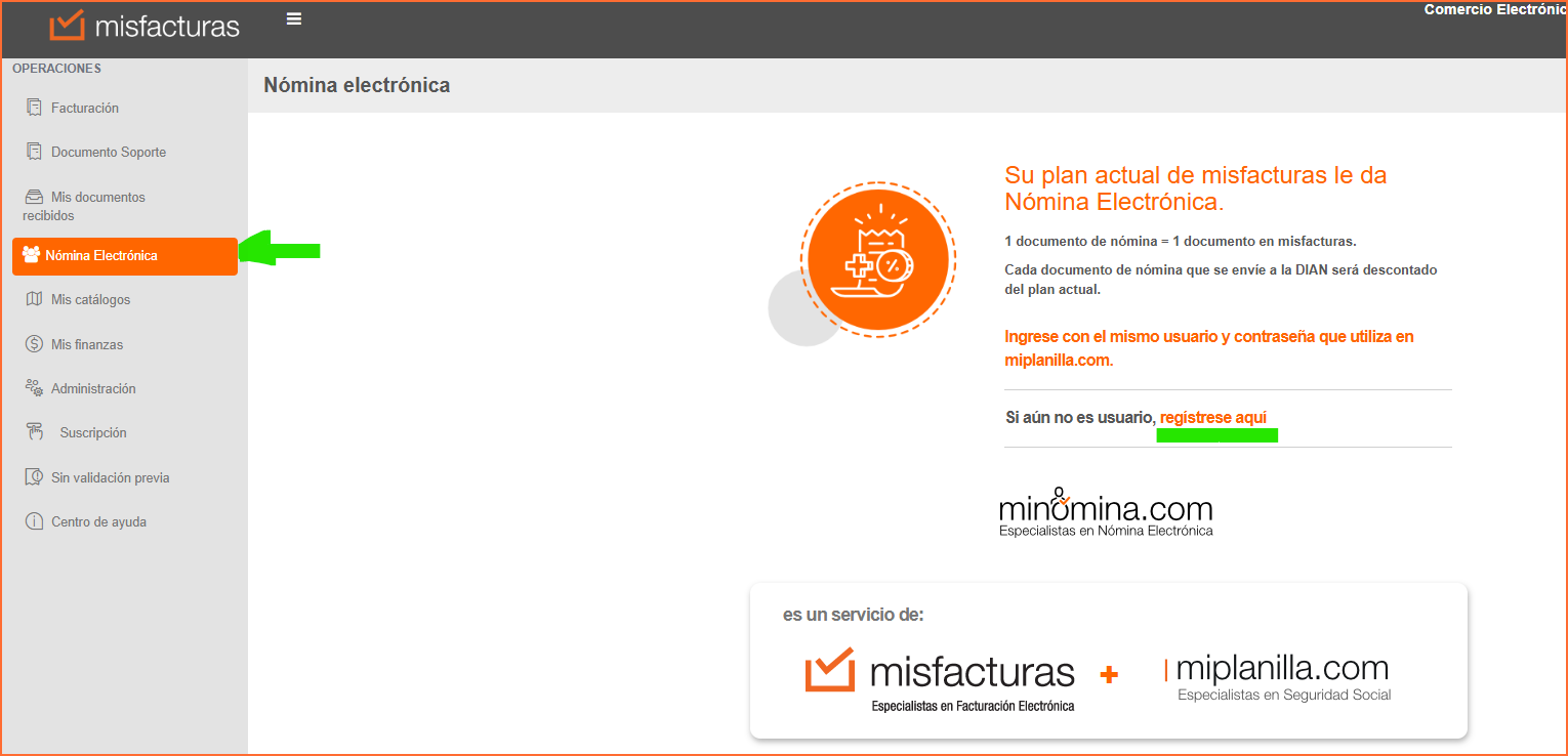 Mencionado esto, desde mis facturas usted visualizara la Operación Nomina Electrónica, en esta Operación le mostrar la explicación de que por cada nomina que sea enviada y aceptada por la Dian, se descontará del plan de facturación 1 documento, adicional le dará la opción de Regístrese Aquí.