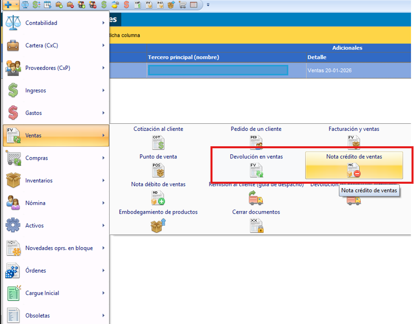 Elija el tipo de documento correspondiente (Nota crédito de ventas o Devolución en ventas, según aplique).