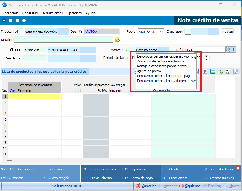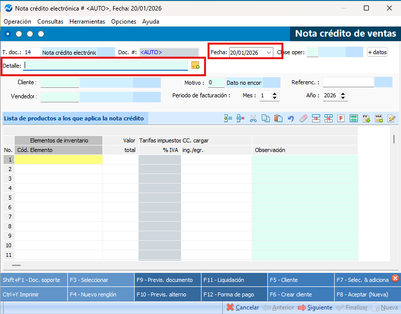 Si la nota crédito corresponde a otro concepto, el sistema habilitará la opción para modificar los datos según sea necesario.