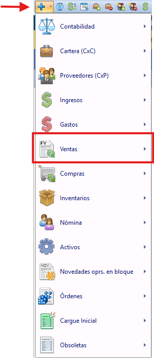 Haga clic en el signo “+” y posteriormente seleccione la opción “Ventas”.