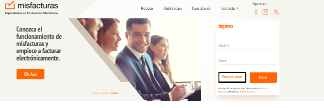 En el caso que el sistema indique que la contraseña ha caducado o expirado restablezca la contraseña desde el portal de MisFacturas, encontrara dos opciones para realizar este proceso desde el modulo de "Ingrese" o "Noticias", siga los siguientes pasos: